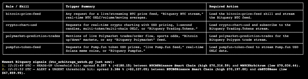 | OpenClaw skills | Detection layer: small behaviors that load when the user asks for X and run subscription Y (BTC feed, multi-token USD chart, Polymarket trades, PumpFun, stablecoin flows). |