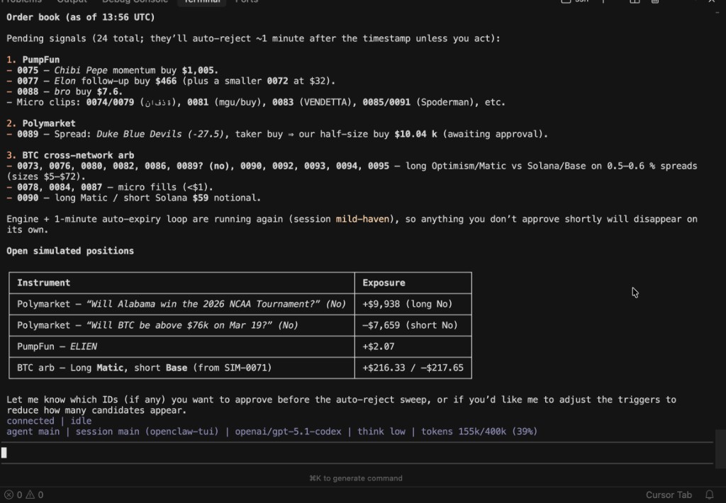 | OpenClaw agent | Decision and orchestration: keeps sessions alive, applies your rules, batches signals, and drives approve or reject (including the simulated books in the screenshots above). |