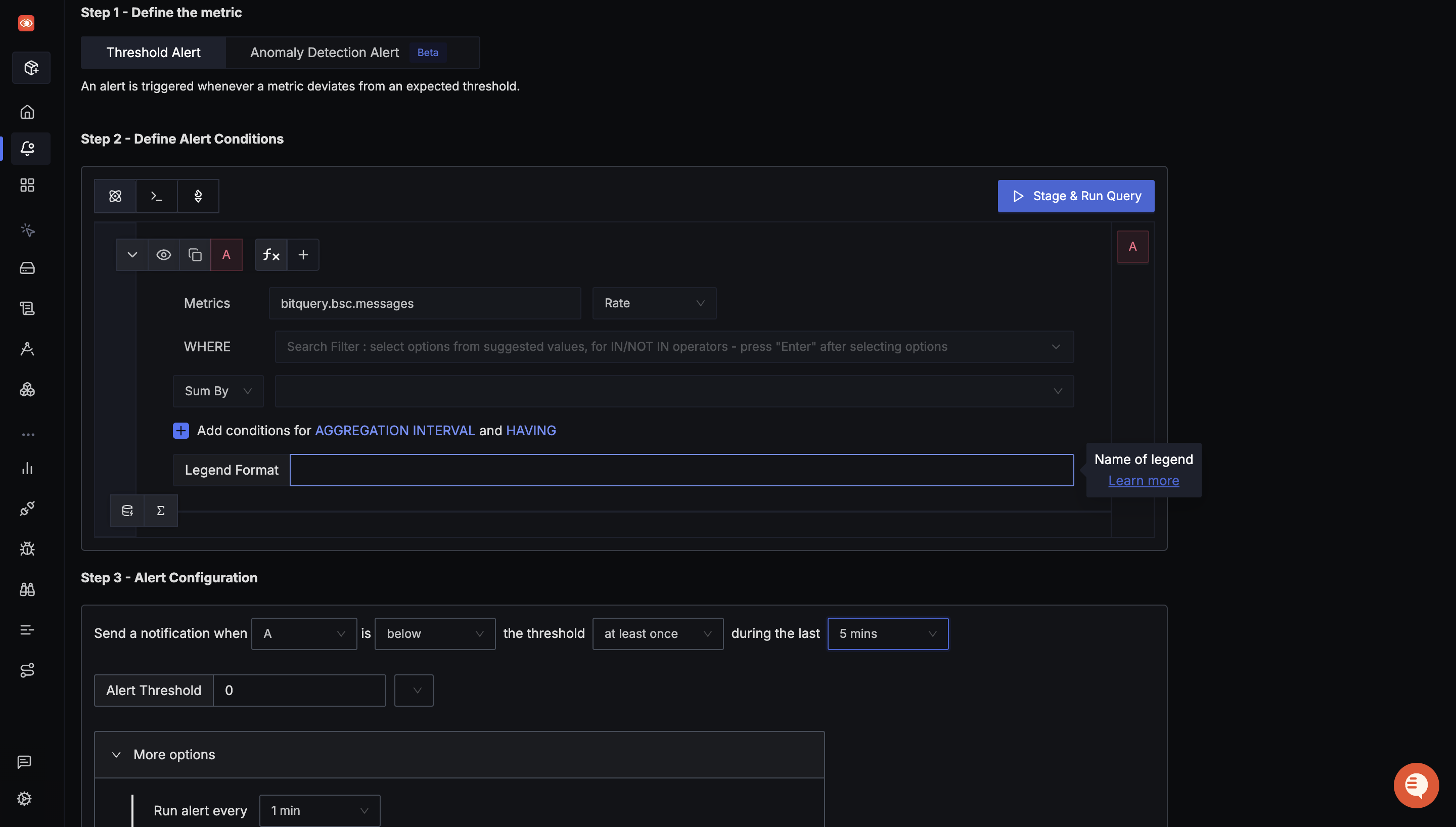 bitquery.<network>.messages≤ 0 for 5 mins - Action: Page; annotate dashboard