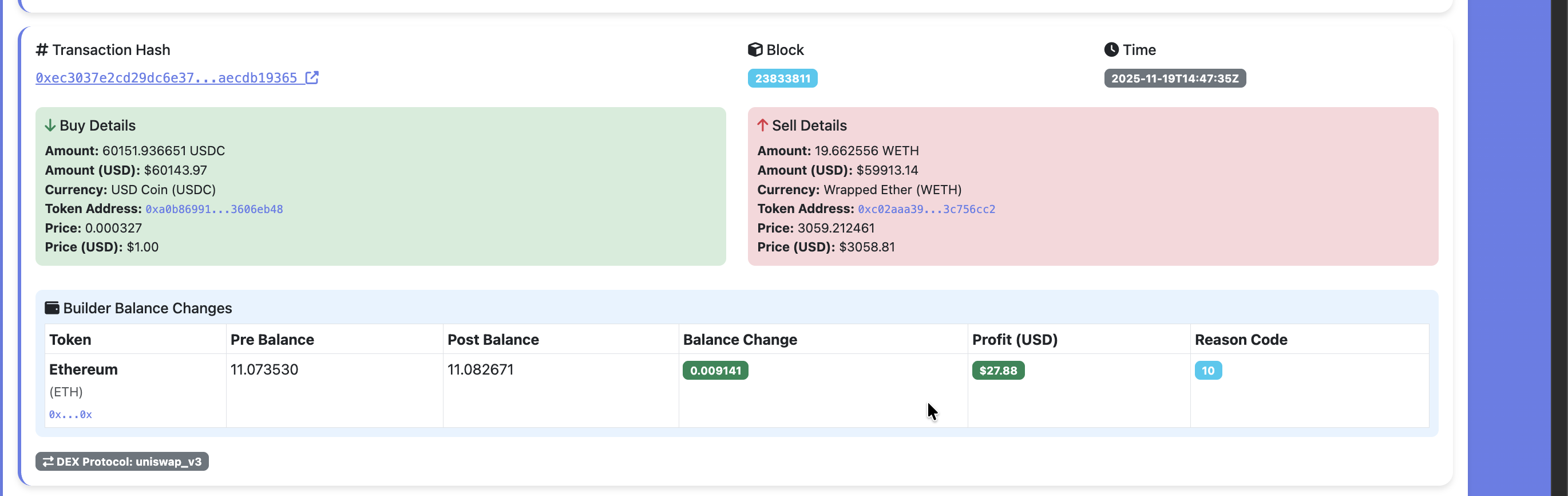 This filtering ensures the dashboard focuses on trades where MEV builders are actively participating, making it easier to track their profit patterns.