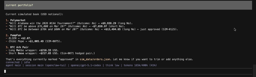 | OpenClaw agent | Decision and orchestration: keeps sessions alive, applies your rules, batches signals, and drives approve or reject (including the simulated books in the screenshots above). |